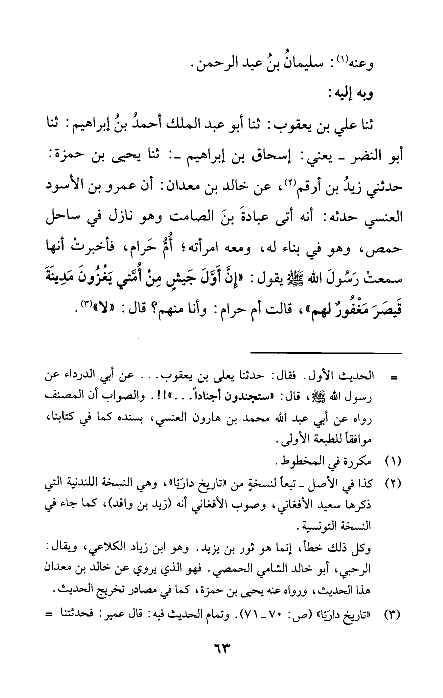 ثنا علي بن يعقوب: ثنا أبو عبد الملك أحمد بن إبراهيم: ثنا أبو النضر –يعني: إسحاق بن إبراهيم-: ثنا يحيى بن حمزة: حدثني زيد بن أرقم، عن خالد بن معدان: أن عمرو بن الأسود العنسي حدثه: أنه أتى عبادة بن الصامت وهو نازل في ساحل حمص، وهو في بناء له، ومعه امرأته؛ أم حرام، فأخبرت أنها سمعت رسول الله صلى الله عليه وسلم يقول: ((إن أول جيشٍ من أمتي يغزون مدينة قيصر مغفورٌ لهم))، قالت أم حرام: وأنا منهم؟ قال: ((لا)).