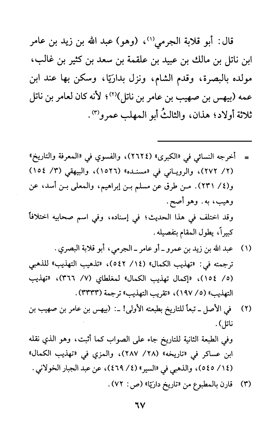 قال: أبو قلابة الجرمي، (وهو) عبد الله بن زيد بن عامر ابن ناتل بن مالك بن عبيد بن علقمة بن سعد بن كثير بن غالب، مولده بالبصرة، وقدم الشام، ونزل بداريا، وسكن بها عند ابن عمه (بيهس بن صهيب بن عامر بن ناتل)؛ لأنه كان لعامر بن ناتل ثلاثة أولاد؛ هذان، والثالث أبو المهلب عمرو.