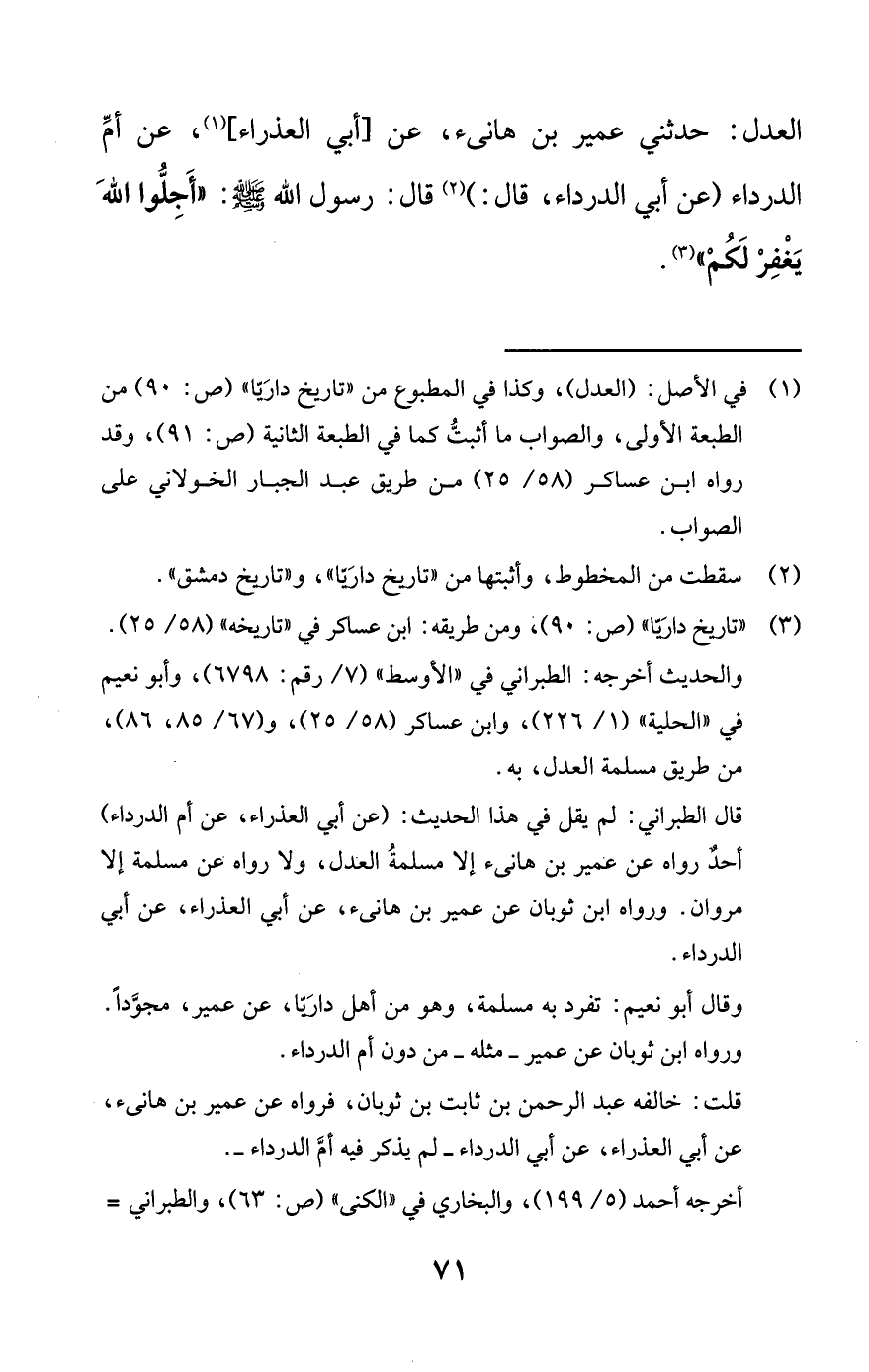 العدل: حدثني عمير بن هانئ، عن [أبي العذراء]، عن أم الدرداء (عن أبي الدرداء، قال:) قال: رسول الله صلى الله عليه وسلم : ((أجلوا الله يغفر لكم)).