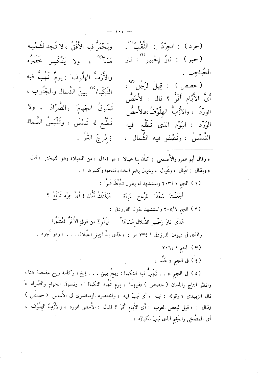 (حصص) : قيلَ لرَجُل: أيُّ الأَيّام أَقَرُّ؟ قال: الأَحَصُّ الورْدُ، والأَزَبُّ الهِلَّوْفُ، فالأَحصُّ الوَرْد: اليَوْم الذي تَطْلُع فيه الشَّمْسُ، وتَصْفو فيه الشَّمال، ويَحْمَرُّ فيه الأَفُقُ، لا تَجد لَشمْسِه مَسّاً، ولا يَنْكَسر خَضَرُه والأَزَبُّ الهلَّوف: يومٌ تَهبُّ فيه النَّكْباءُ بينَ الشَّمال والجَنُوب، تَسُوقُ الجَهامَ والصُّرّادَ، ولا تَطْلُع له شَمْس، وتَلْبَسُ السَّماءُ زِبْرجَ القُرِّ.