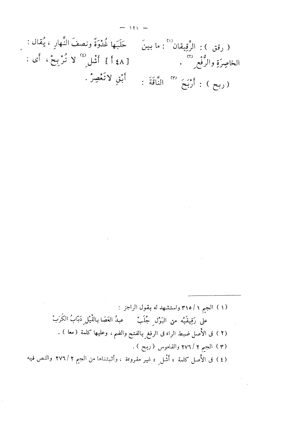 (ربح) : أَرْبَحَ النَّاقَةَ: حَلَبَها غُدْوَةً ونصفَ النَّهار، يُقال أَشْلِ لا تُرْبِحْ، أي أَبْقِ لا تَعصِرْ.