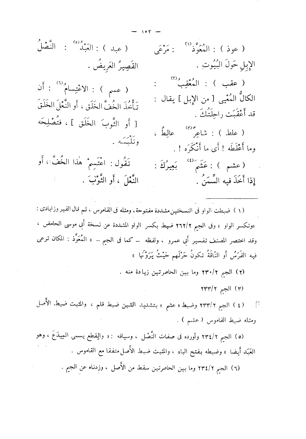 (عوذ) : المُعَوَّذ: مَرْعَى الإِبِل حَولَ البُيُوتِ.