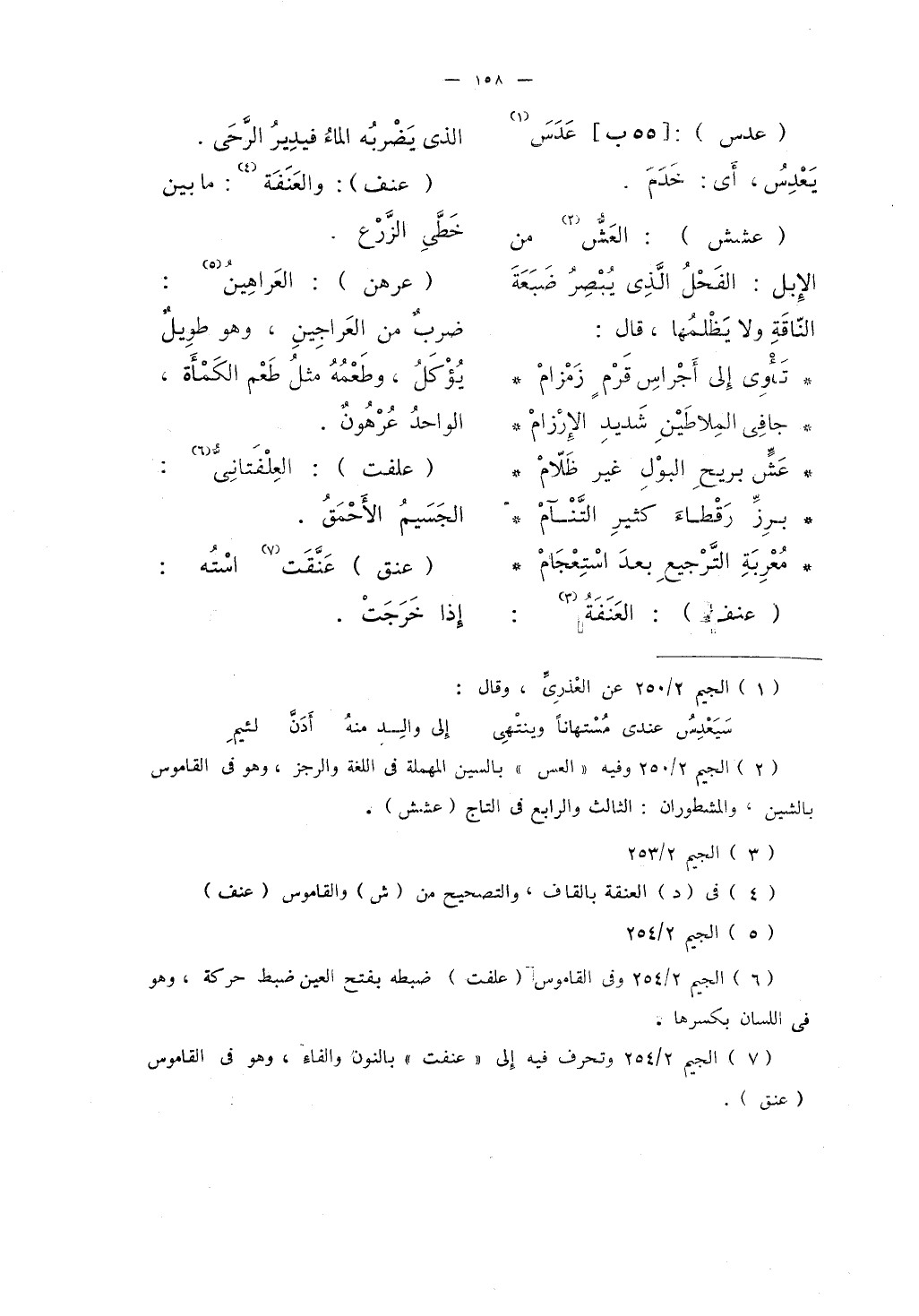 (عنق) : عَنَّقَت اسْتُه: إذا خَرَجَتْ.