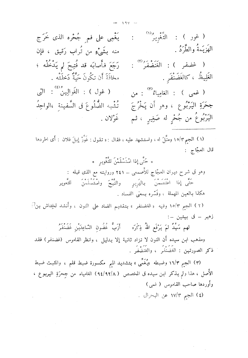 (غضفر) : الغَنَضْفَرُ: الغَلِيظُ، كالغَضَنْفَرِ (غمى) : الغامِياءُ: من جحَرَةِ اليَرْبُوع، وهو أَن يَخْرُجَ اليَرْبُوعُ من حُجْرٍ له صَغِيرٍ، ثم يَغْمِى على فمِ حُجْره الذي خَرَج منه بشَيءٍ من تُراب رَقيق، فإن رَجَعَ فأصابَه قد فُتِحَ لم يَدْخُلُه مخافَةَ أَن يكُونَ حَيَّةٌ دَخلَتْه.