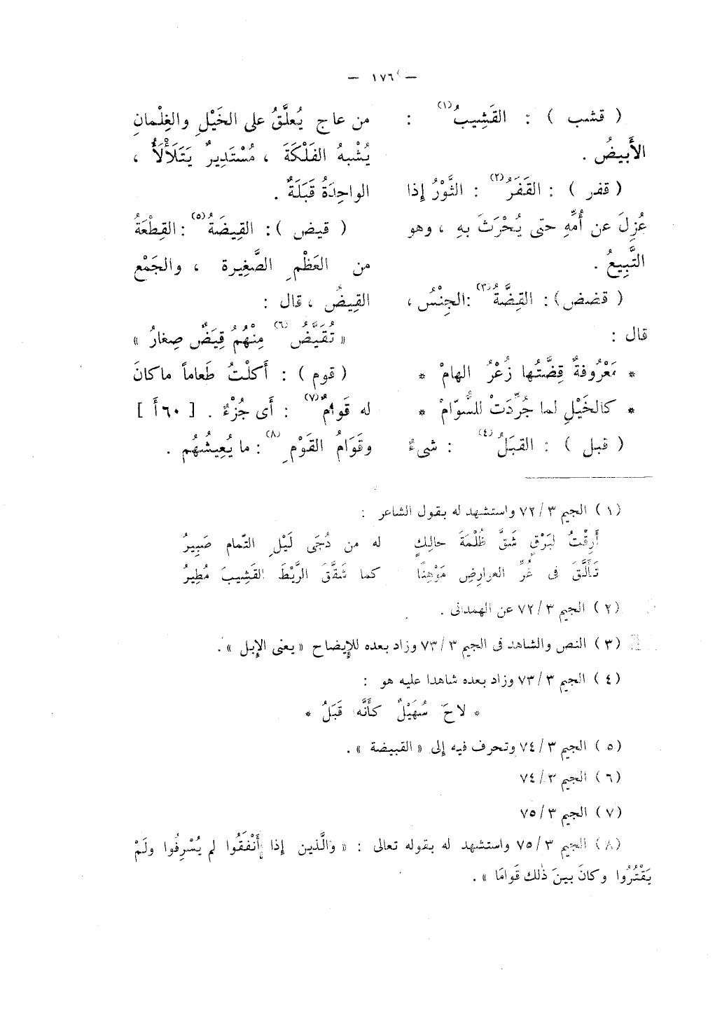 (قيض) القِيضَةُ: القِطْعَةُ من العَظْمِ الصَّغِيرة، والجَمْع القِِيضُ، قال: "تُقَيَّضُ منهُمُ قِيَضٌ صِغارُ" (قوم) : أَكلْتُ طَعاماً ما كانَ له قَوامٌ: أي جُزْءٌ. وقَوَامُ القَوْم: ما يُعِيشُهُم.
