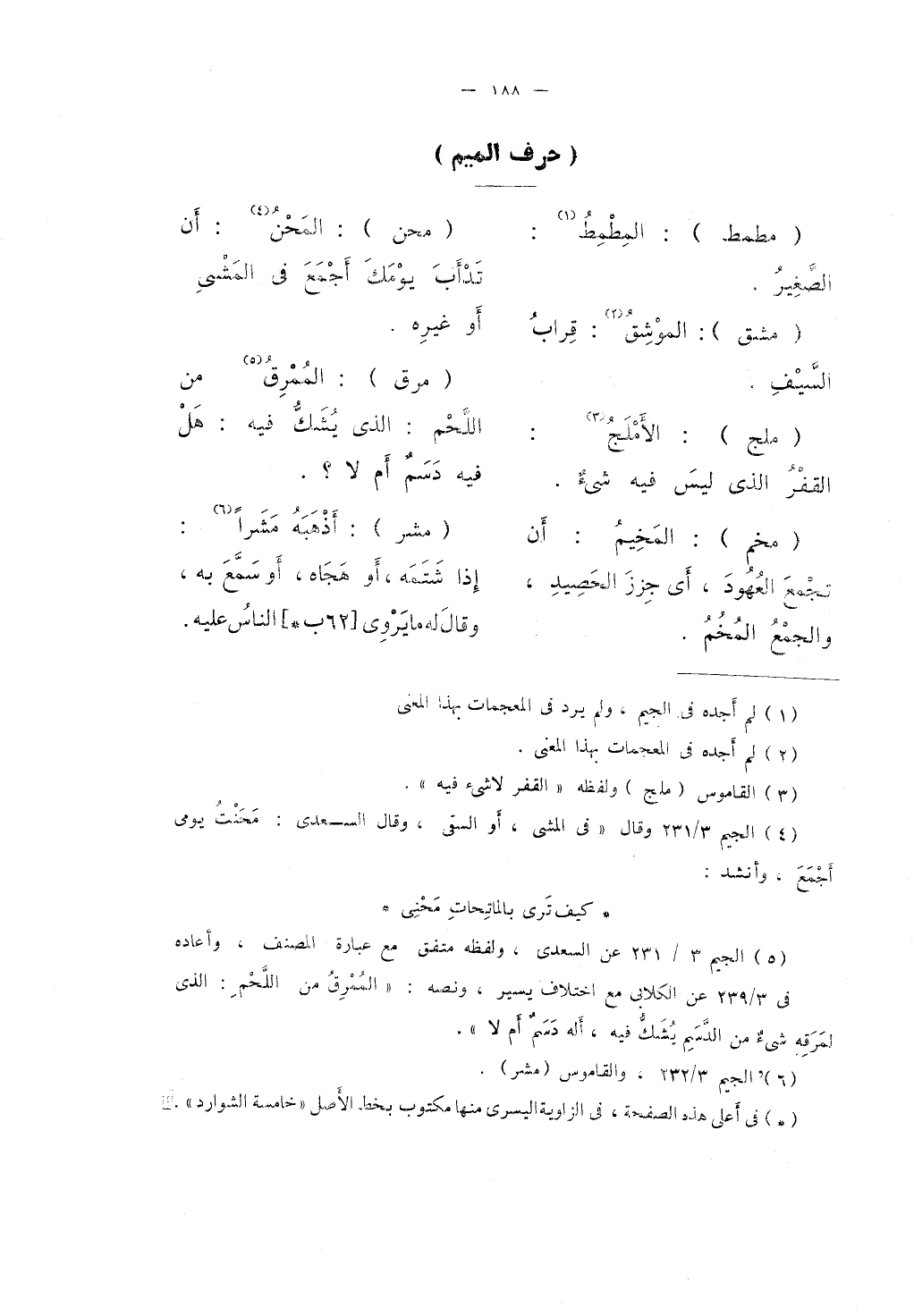 (مرق) : المُمْرِقُ من اللَّحْم: الذي يَشَكُّ فيه: هَلْ فيه دَسَمٌ أم لا؟ (مشر) : أَذْهَبَهُب مَشَراً: إذا شَتَمَه، أَو هَجَاه، أَو سَمَّعَ به، وقال له ما يَرْوِى الناسُ عليه.