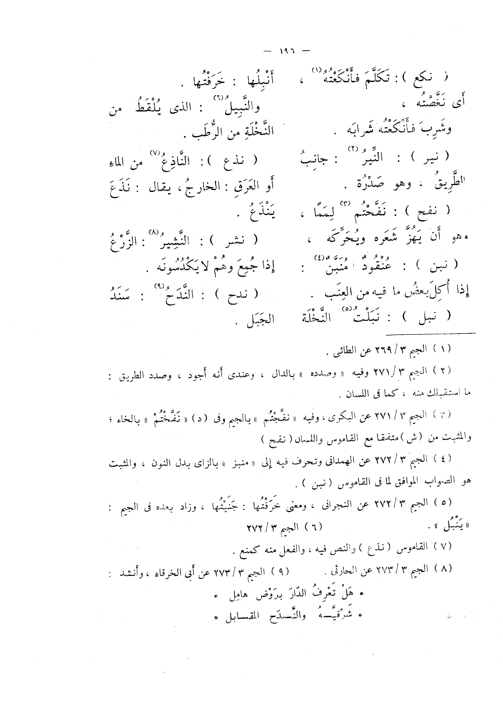(نفح) : نَفَّحْتُم لِمماً، وهو أَن يَهُزَّ شَعَره ويُحَرِّكَه، (نبن) : عُنْقُودٌ مُنَبَّنٌ: إذا أُكِلَ بعضُ ما فيه من العِنَب.