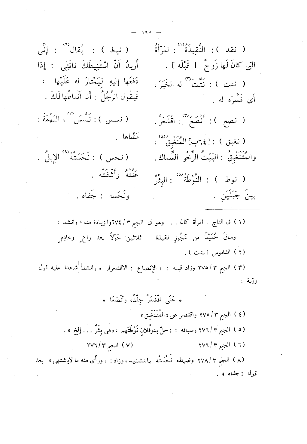 (نيط) : يُقال: إِنِّي أُريدُ أَنْ اسْتَنِيطَكَ ناقَتِي: إذا دَفَعها إليهِ لِتَمتارَ له عَلَيها، فَيقُول الرَّجُلُ: أنا أَنْتاطُها لَكَ.