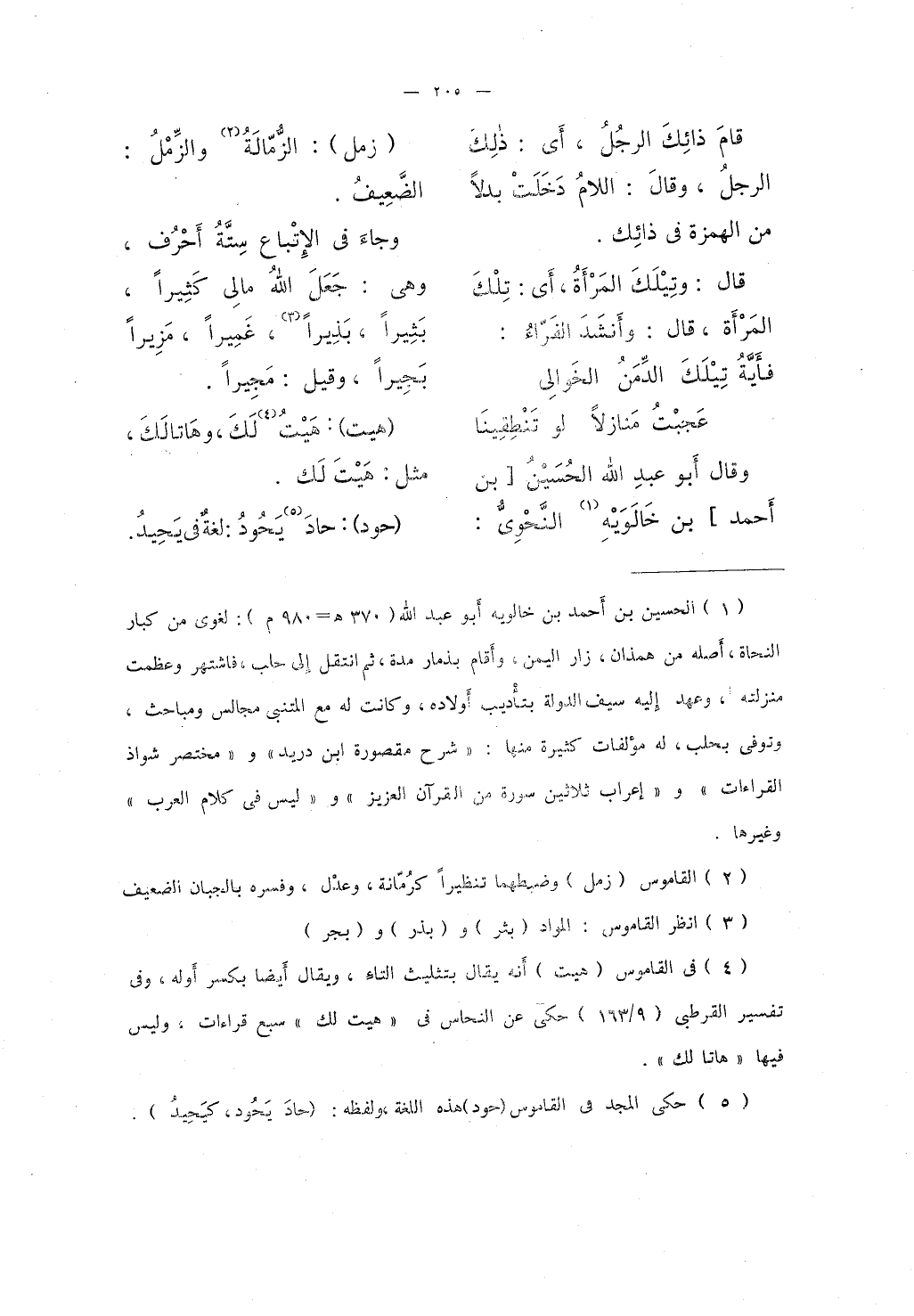 وقال أبو عبدِ الله الحُسَيْنُ [بن أحمد] بن خَاَلَويْه النَّحْوِيُّ: (زمل) : الزُّمّالَةُ والزِّمْلُ الضَّعِيفُ.