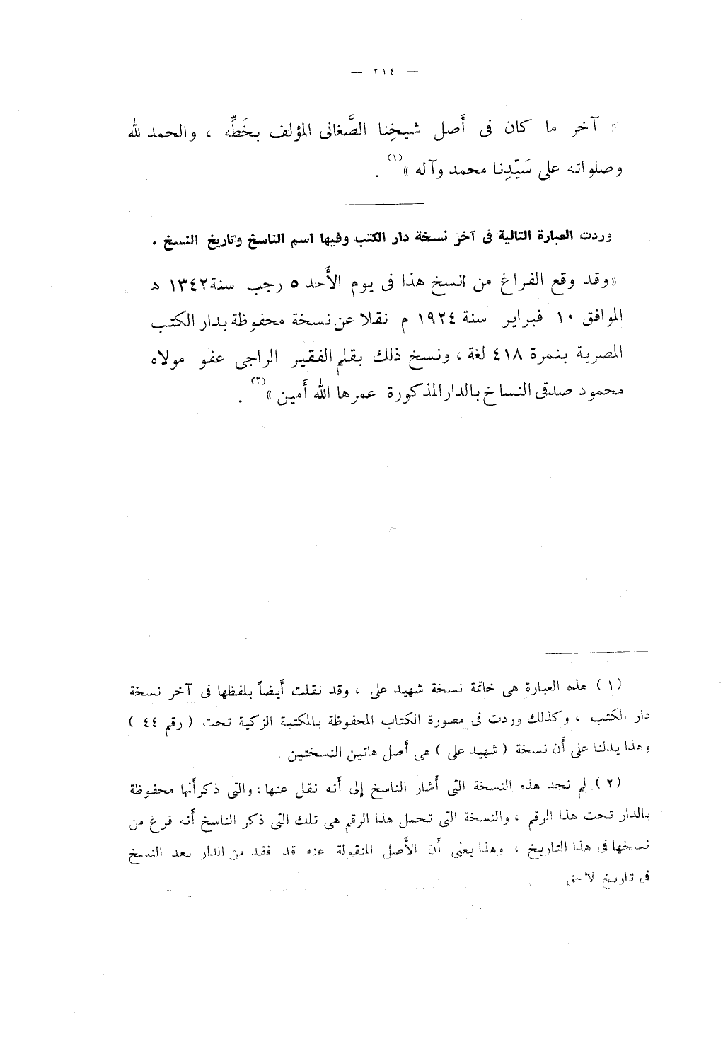 "آخر ما كان في أَصل شيخِنا الصَّغاني المؤلف بخَطِّه، والحمد لله وصلواته على سَيِّدنا محمد وآله".