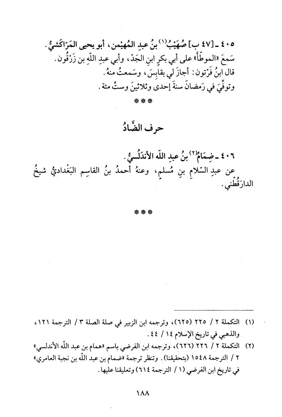 2) التكملة 2/ 226 (626)، وترجمه ابن الفرضي باسم «همام بن عبد اللّه الأندلسي» 2 /الترجمة 1548 (بتحقيقنا). وتنظر ترجمة «ضمام بن عبد اللّه بن نجبة العامري» في تاريخ ابن الفرضي (1 /الترجمة 614) وتعليقنا عليها.