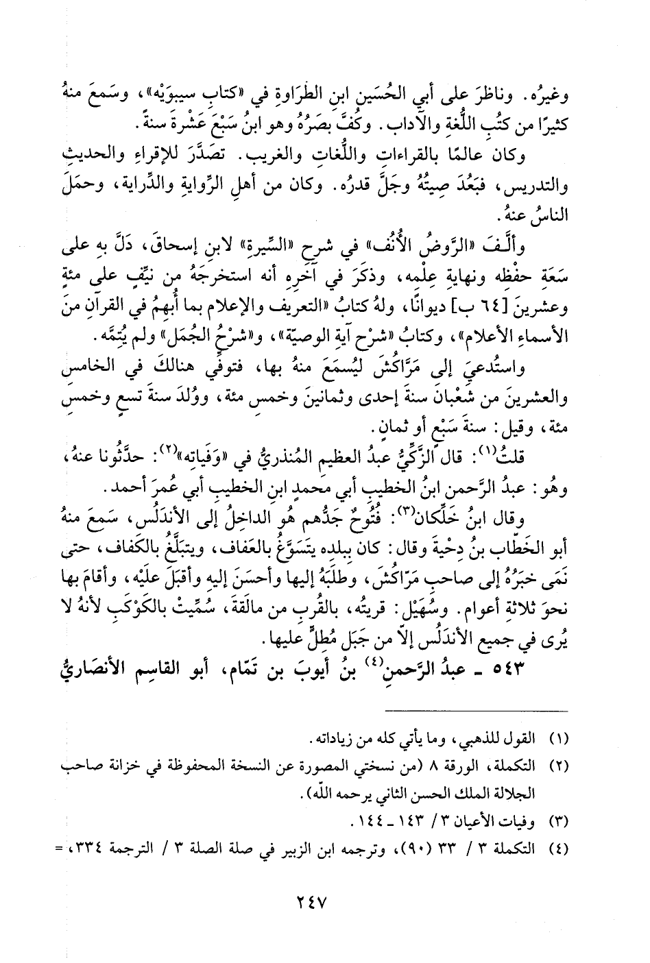 وألّف «الرّوض الأنف» في شرح «السّيرة» لابن إسحاق، دلّ به على سعة حفظه ونهاية علمه، وذكر في آخره أنه استخرجه من نيّف على مئة وعشرين [64 ب] ديوانا، وله كتاب «التعريف والإعلام بما أبهم في القرآن من الأسماء الأعلام»، وكتاب «شرح آية الوصيّة»، و «شرح الجمل» ولم يتمّه.