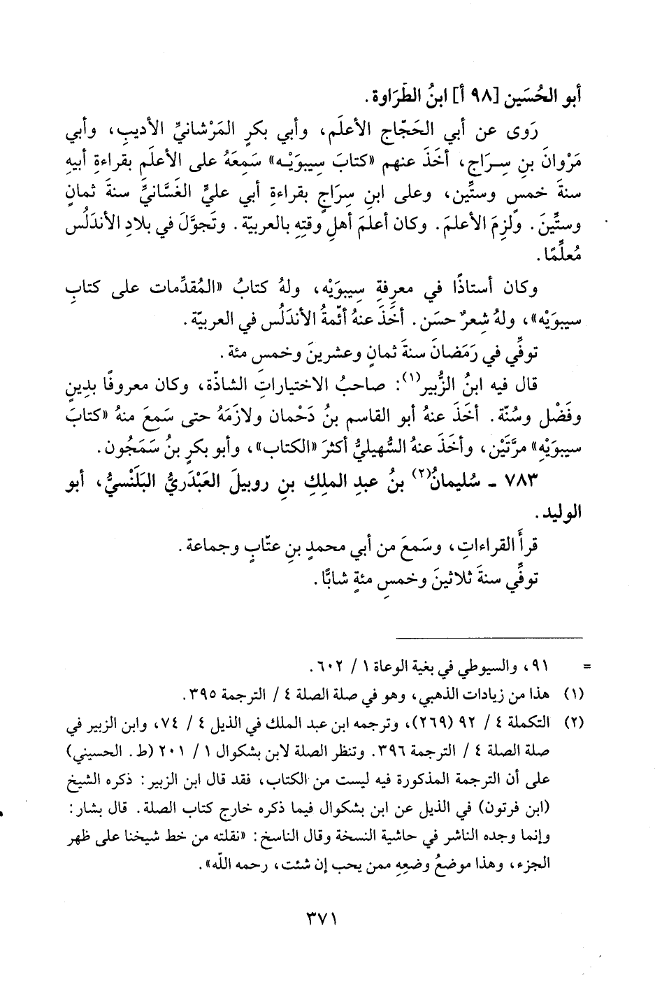 2) التكملة 4/ 92 (269)، وترجمه ابن عبد الملك في الذيل 4/ 74، وابن الزبير في صلة الصلة 4 /الترجمة 396. وتنظر الصلة لابن بشكوال 1/ 201 (ط. الحسيني) على أن الترجمة المذكورة فيه ليست من الكتاب، فقد قال ابن الزبير: ذكره الشيخ (ابن فرتون) في الذيل عن ابن بشكوال فيما ذكره خارج كتاب الصلة. قال بشار: وإنما وجده الناشر في حاشية النسخة وقال الناسخ: «نقلته من خط شيخنا على ظهر الجزء، وهذا موضع وضعه ممن يحب إن شئت، رحمه اللّه».