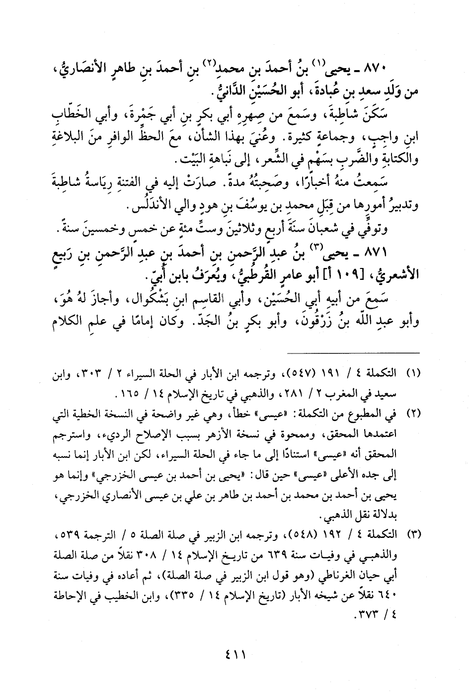 2) في المطبوع من التكملة: «عيسى» خطأ، وهي غير واضحة في النسخة الخطية التي اعتمدها المحقق، وممحوة في نسخة الأزهر بسبب الإصلاح الرديء، واسترجم المحقق أنه «عيسى» استنادا إلى ما جاء في الحلة السيراء، لكن ابن الأبار إنما نسبه إلى جده الأعلى «عيسى» حين قال: «يحيى بن أحمد بن عيسى الخزرجي» وإنما هو يحيى بن أحمد بن محمد بن أحمد بن طاهر بن علي بن عيسى الأنصاري الخزرجي، بدلالة نقل الذهبي.