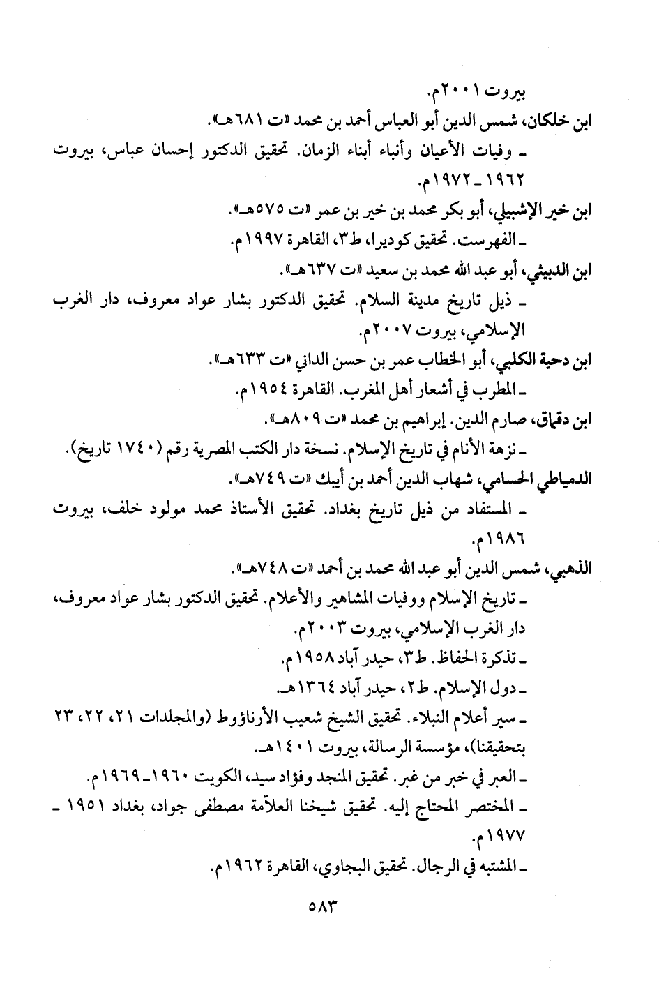 - تاريخ الإسلام ووفيات المشاهير والأعلام. تحقيق الدكتور بشار عواد معروف، دار الغرب الإسلامي، بيروت 2003 م.