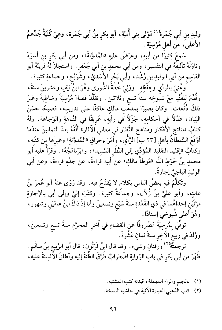 وعني بالرأي وحفظه. وولي خطّة الشّورى وهو ابن نيّف وعشرين سنة، وقدّم للفتيا مع شيوخه سنة تسع وثلاثين. وتقلّد قضاء مرسية وشاطبة وغير ذلك دفعات. وكان بصيرا بمذهب مالك عاكفا على تدريسه، فصيحا حسن البيان، عدلا في أحكامه، جزلا في رأيه، عريقا في النّباهة والوجاهة. وله كتاب «نتائج الأفكار ومناهج النّظار في معاني الآثار» ألّفه بعد الثمانين عند ما أوقع السّلطان بأهل [23 ب] الرّأي، وأمر بإحراق «المدوّنة» وغيرها من كتبه، وكتاب «إقليد التقليد المؤدّي إلى النّظر السّديد»، و «برنامجه». وقرأ عليه أبو محمد بن حوط اللّه «موطأ مالك» عن أبيه قراءة، عن جدّه قراءة، وعن أبي الوليد الباجيّ إجازة.