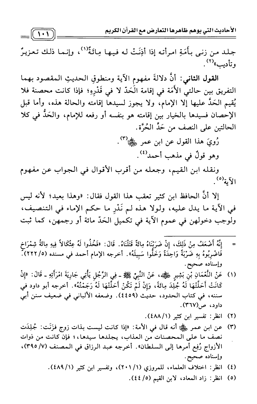 القول الثاني: أنَّ دلالةَ مفهومِ الآية ومنطوقِ الحديثِ المقصود بهما التفريق بين حالتي الأَمَة في إقامة الحَدّ لا في قَدْرِهِ؛ فإذا كانت محصنة فلا يُقيم الحَدَّ عليها إلا الإمام، ولا يجوز لسيدها إقامته والحالة هذه، وأما قبل الإحصان فسيدها بالخيار بين إقامته هو بنفسه أو رفعه للإمام، والحَدُّ في كلا الحالتين على النصف من حَدِّ الحُرَّة.