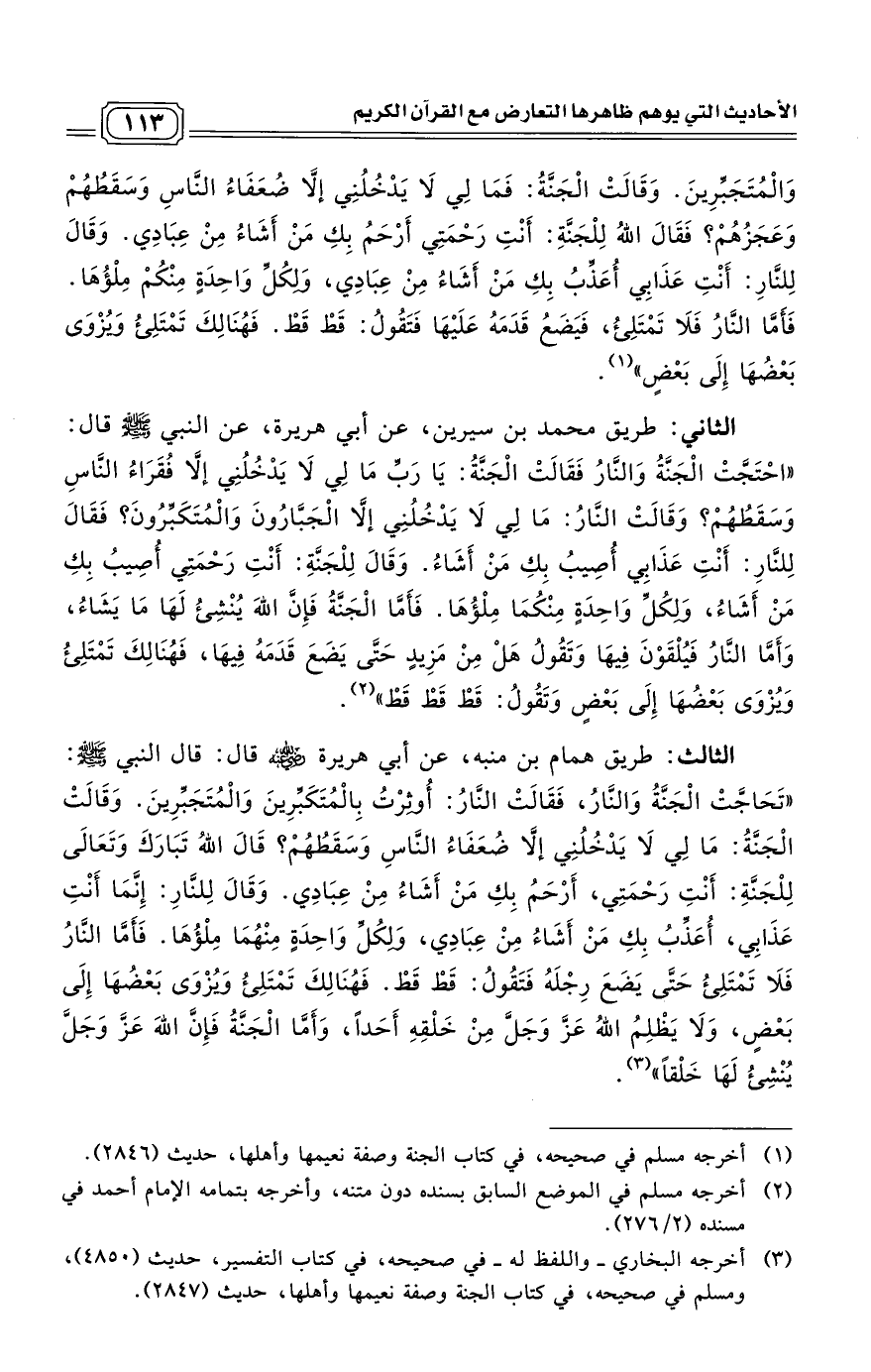الثالث: طريق همام بن منبه، عن أبي هريرة - رضي الله عنه - قال: قال النبي - صلى الله عليه وسلم -: "تَحَاجَّتْ الْجَنَّةُ وَالنَّارُ، فَقَالَتْ النَّارُ: أُوثِرْتُ بِالْمُتَكَبِّرِينَ وَالْمُتَجَبِّرِينَ. وَقَالَتْ الْجَنَّةُ: مَا لِي لاَ يَدْخُلُنِي إلاَّ ضُعَفَاءُ النَّاسِ وَسَقَطُهُمْ؟ قَالَ اللَّهُ تَبَارَكَ وَتَعَالَى لِلْجَنَّةِ: أَنْتِ رَحْمَتِي، أَرْحَمُ بِكِ مَنْ أَشَاءُ مِنْ عِبَادِي. وَقَالَ لِلنَّارِ: إِنَّمَا أَنْتِ عَذَابِي، أُعَذِّبُ بِكِ مَنْ أَشَاءُ مِنْ عِبَادِي، وَلِكُلِّ وَاحِدَةٍ مِنْهُمَا مِلْؤُهَا. فَأَمَّا النَّارُ فَلاَ تَمْتَلِئُ حَتَّى يَضَعَ رِجْلَهُ فَتَقُولُ: قَطْ قَطْ. فَهُنَالِكَ تَمْتَلِئُ وَيُزْوَى بَعْضُهَا إِلَى بَعْضٍ، وَلاَ يَظْلِمُ اللَّهُ عَزَّ وَجَلَّ مِنْ خَلْقِهِ أَحَدًا، وَأَمَّا الْجَنَّةُ فَإِنَّ اللَّهَ عَزَّ وَجَلَّ يُنْشِئُ لَهَا خَلْقاً". (¬3)