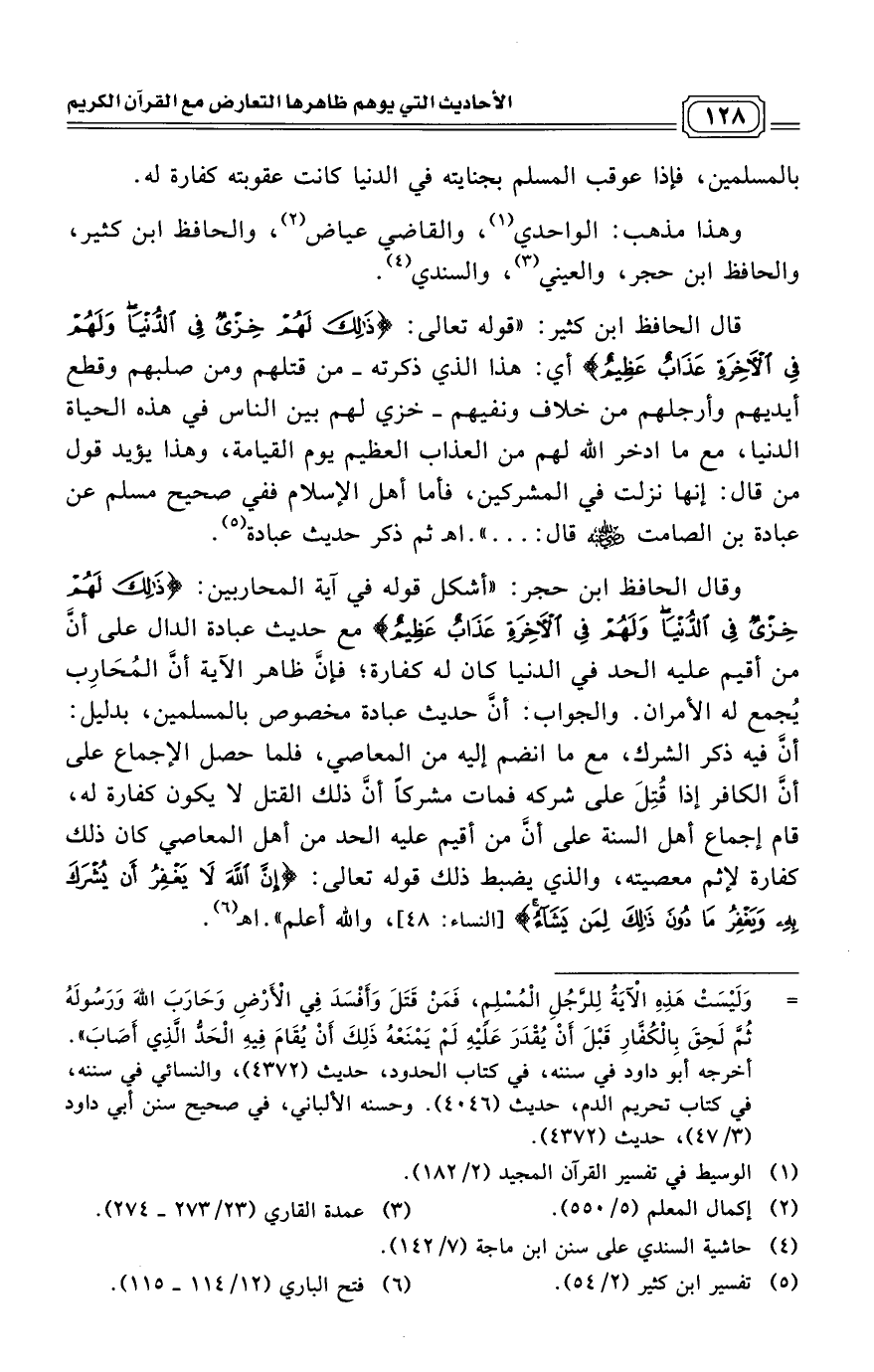 وقال الحافظ ابن حجر: "أشكل قوله في آية المحاربين: (ذَلِكَ لَهُمْ خِزْيٌ فِي الدُّنْيَا وَلَهُمْ فِي الْآخِرَةِ عَذَابٌ عَظِيمٌ) مع حديث عبادة الدال على أنَّ من أقيم عليه الحد في الدنيا كان له كفارة؛ فإنَّ ظاهر الآية أنَّ المُحَارِب يُجمع له الأمران. والجواب: أنَّ حديث عبادة مخصوص بالمسلمين، بدليل: أنَّ فيه ذكر الشرك، مع ما انضم إليه من المعاصي، فلما حصل الإجماع على أنَّ الكافر إذا قُتِلَ على شركه فمات مشركاً أنَّ ذلك القتل لا يكون كفارة له، قام إجماع أهل السنة على أنَّ من أقيم عليه الحد من أهل المعاصي كان ذلك كفارة لإثم معصيته، والذي يضبط ذلك قوله تعالى: (إِنَّ اللَّهَ لَا يَغْفِرُ أَنْ يُشْرَكَ بِهِ وَيَغْفِرُ مَا دُونَ ذَلِكَ لِمَنْ يَشَاءُ) [النساء: 48]، والله أعلم". اهـ (¬6)