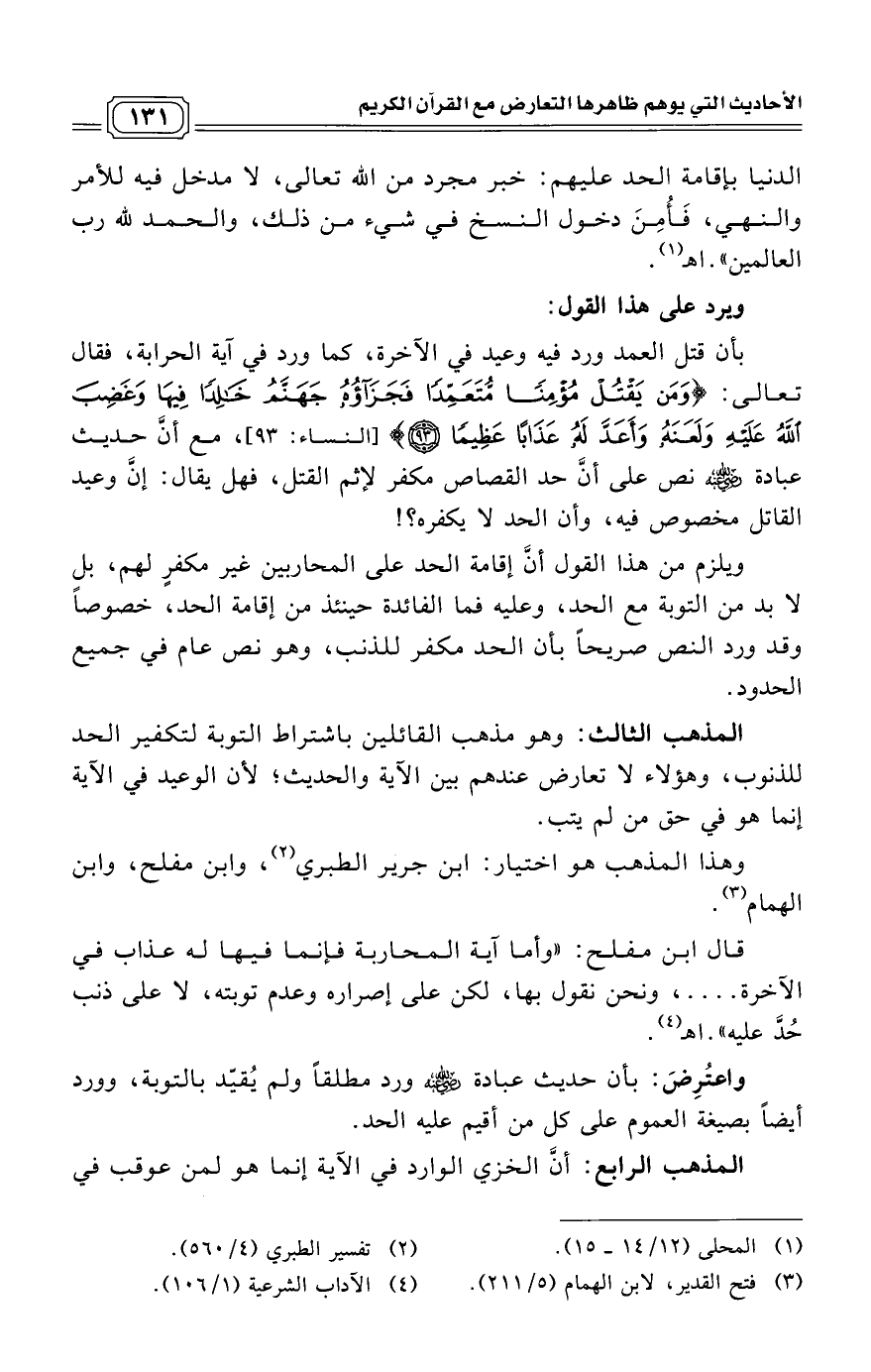 قال ابن مفلح: "وأما آية المحاربة فإنما فيها له عذاب في الآخرة .... ، ونحن نقول بها، لكن على إصراره وعدم توبته، لا على ذنب حُدَّ عليه". اهـ (¬4)