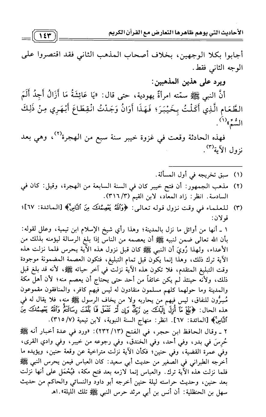 (¬3) للعلماء في وقت نزول قوله تعالى: (وَاللَّهُ يَعْصِمُكَ مِنَ النَّاسِ) [المائدة: 67]؛ قولان: