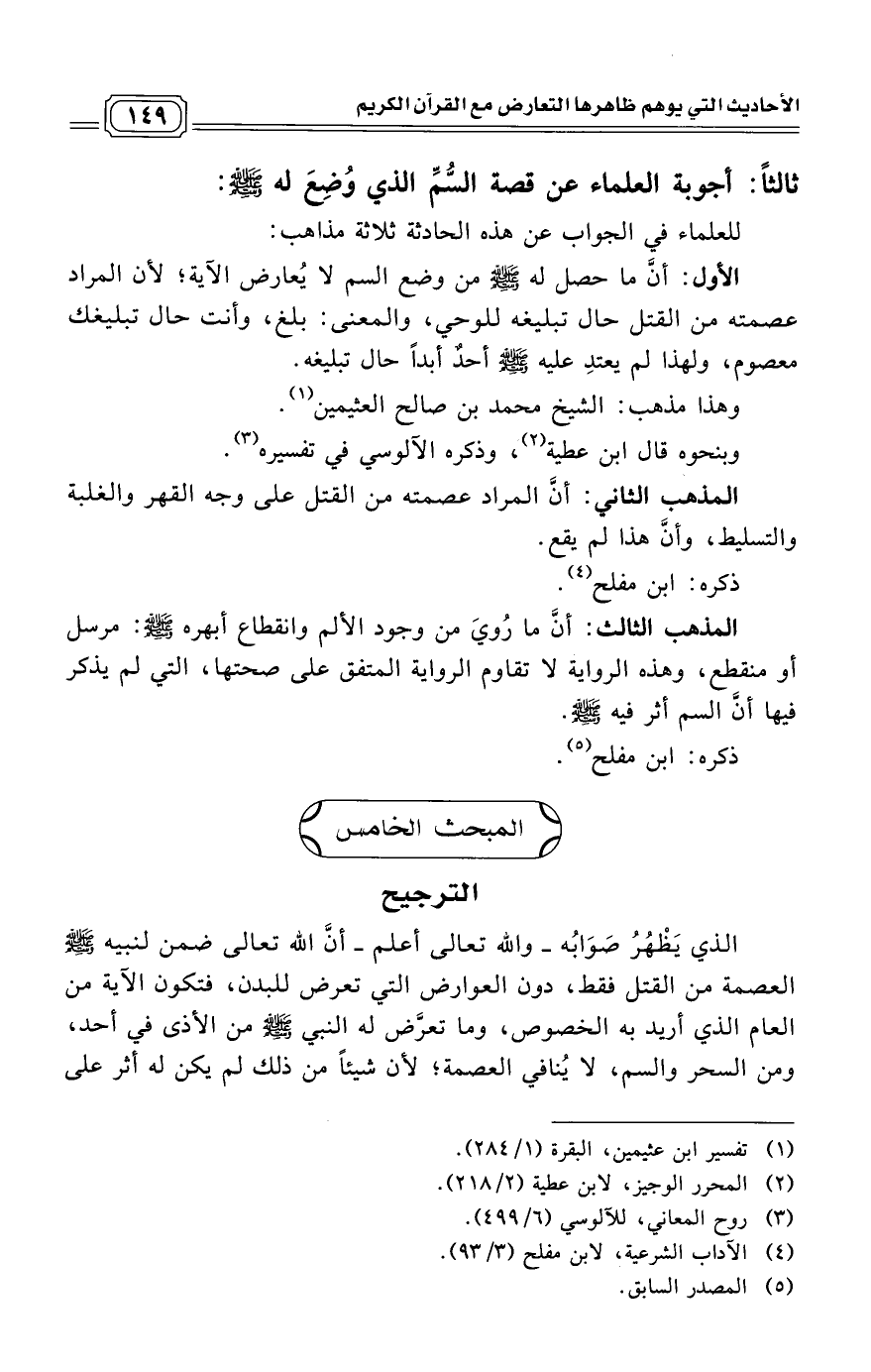 الذي يَظْهُرُ صَوَابُه ـ والله تعالى أعلم ـ أنَّ الله تعالى ضمن لنبيه - صلى الله عليه وسلم - العصمة من القتل فقط، دون العوارض التي تعرض للبدن، فتكون الآية من العام الذي أريد به الخصوص، وما تعرَّض له النبي - صلى الله عليه وسلم - من الأذى في أحد، ومن السحر والسم، لا يُنافي العصمة؛ لأن شيئاً من ذلك لم يكن له أثر على