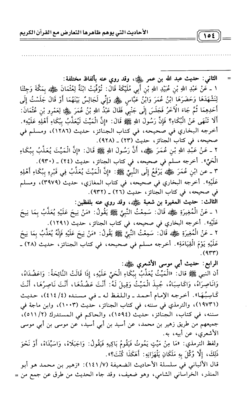 3 - ... عن ابْنِ عُمَرَ - رضي الله عنه - يَرْفَعُ إِلَى النَّبِيِّ - صلى الله عليه وسلم -: "إِنَّ الْمَيِّتَ يُعَذَّبُ فِي قَبْرِهِ بِبُكَاءِ أَهْلِهِ عَلَيْهِ".