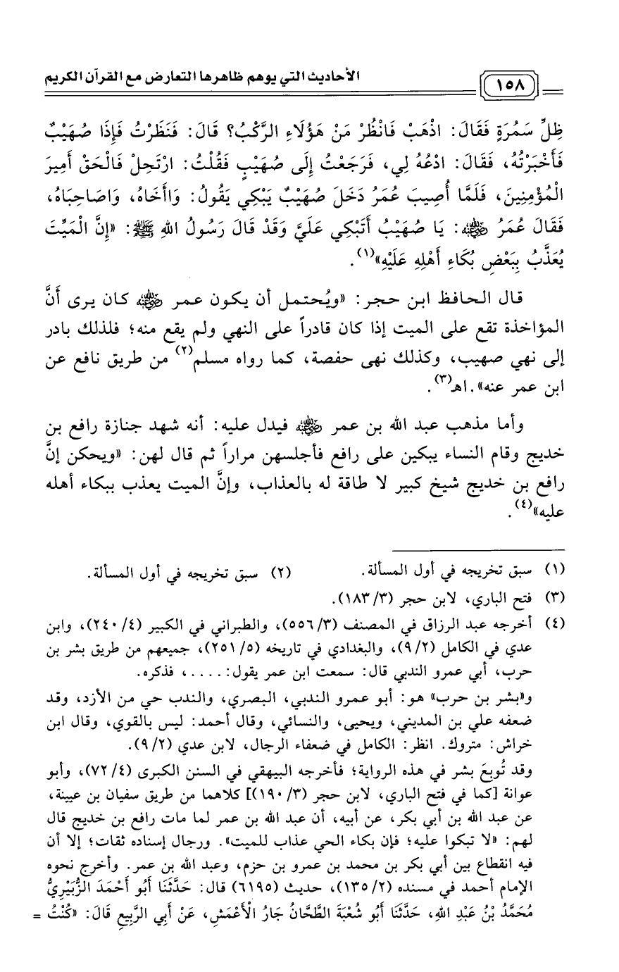 قال الحافظ ابن حجر: "ويُحتمل أن يكون عمر - رضي الله عنه - كان يرى أَنَّ المؤاخذة تقع على الميت إذا كان قادراً على النهي ولم يقع منه؛ فلذلك بادر إلى نهي صهيب، وكذلك نهى حفصة، كما رواه مسلم (¬2) من طريق نافع عن ابن عمر عنه". اهـ (¬3)