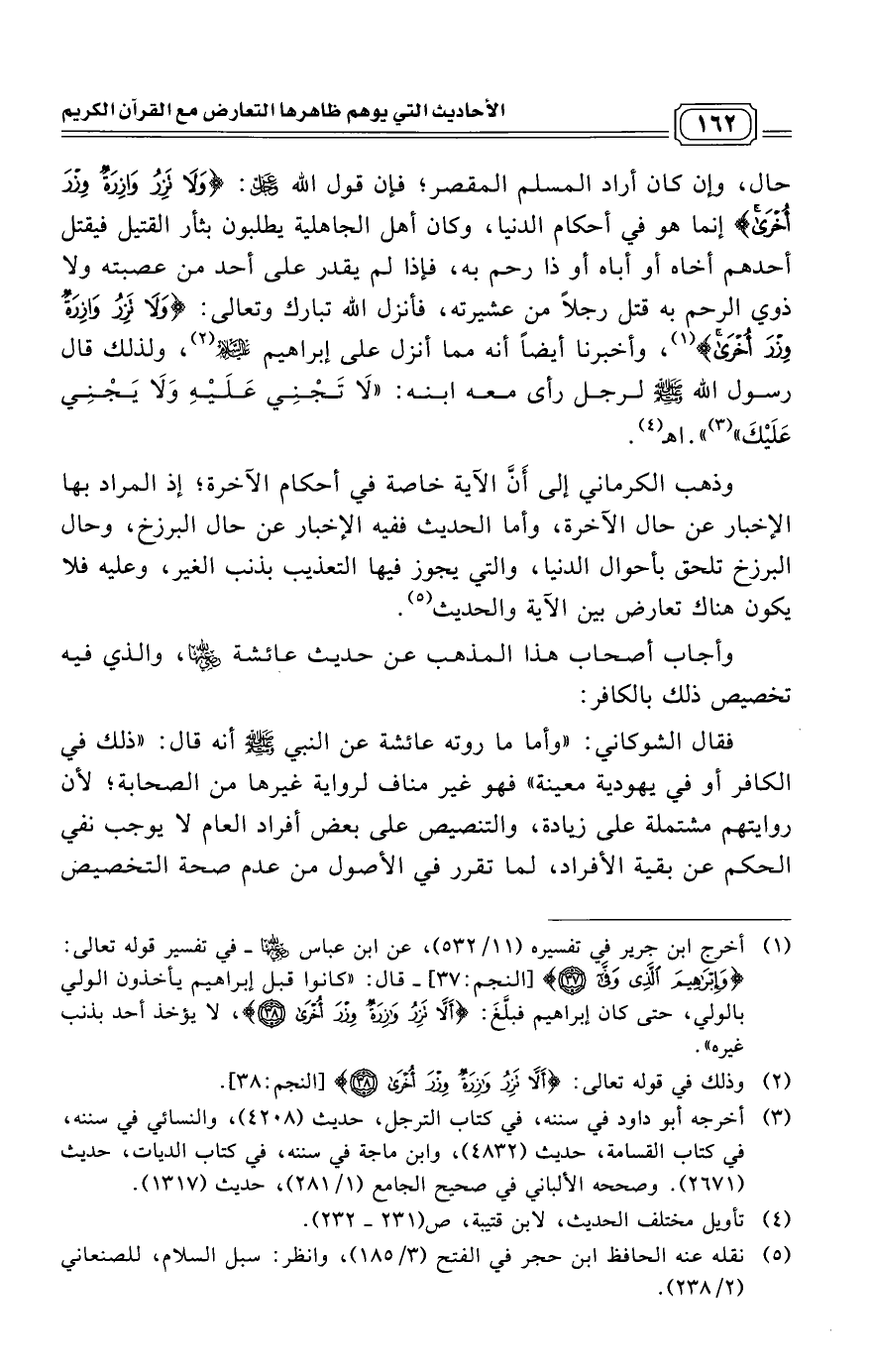 وذهب الكرماني إلى أَنَّ الآية خاصة في أحكام الآخرة؛ إذ المراد بها الإخبار عن حال الآخرة، وأما الحديث ففيه الإخبار عن حال البرزخ، وحال البرزخ تلحق بأحوال الدنيا، والتي يجوز فيها التعذيب بذنب الغير، وعليه فلا يكون هناك تعارض بين الآية والحديث. (¬5)