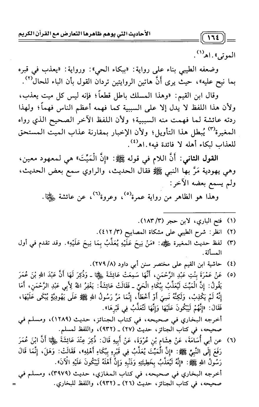 وضعفه الطيبي بناء على رواية: "ببكاء الحي": ورواية: "يعذب في قبره بما نيح عليه"، حيث يرى أَنَّ هاتين الروايتين تردان القول بأن الباء للحال. (¬2)