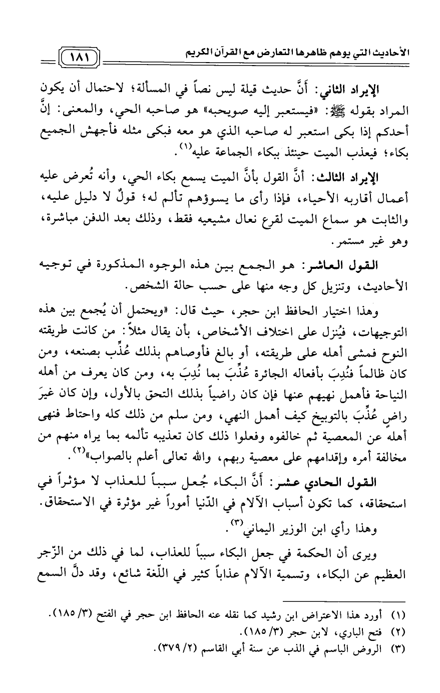 الإيراد الثاني: أَنَّ حديث قيلة ليس نصاً في المسألة؛ لاحتمال أن يكون المراد بقوله - صلى الله عليه وسلم -: "فيستعبر إليه صويحبه" هو صاحبه الحي، والمعنى: إنَّ أحدكم إذا بكى استعبر له صاحبه الذي هو معه فبكى مثله فأجهش الجميع بكاء؛ فيعذب الميت حينئذ ببكاء الجماعة عليه. (¬1)