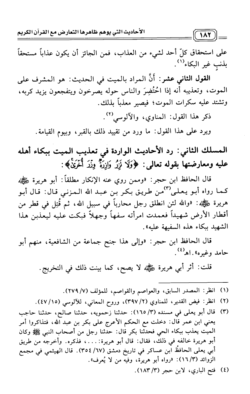 المسلك الثاني: رد الأحاديث الواردة في تعذيب الميت ببكاء أهله عليه ومعارضتها بقوله تعالى: (وَلَا تَزِرُ وَازِرَةٌ وِزْرَ أُخْرَى):
