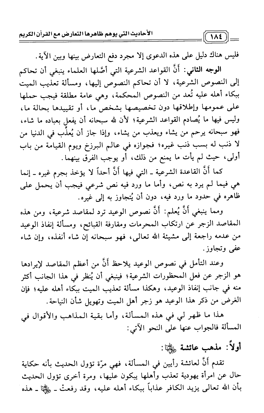 الوجه الثاني: أَنَّ القواعد الشرعية التي أصَّلها العلماء ينبغي أن تحاكم إلى النصوص الشرعية، لا أن تحاكم النصوص إليها، ومسألة تعذيب الميت ببكاء أهله عليه تُعد من النصوص المحكمة، وهي عامة مطلقة فيجب حملها على عمومها وإطلاقها دون تخصيصها بشخص ما، أو تقييدها بحالة ما، وليس فيها ما يُصادم القواعد الشرعية؛ لأن لله سبحانه أن يفعل بعباده ما شاء، فهو سبحانه يرحم من يشاء ويعذب من يشاء، وإذا جاز أن يُعذِّب في الدنيا من لا ذنب له بسب ذنب غيره؛ فجوازه في عالم البرزخ ويوم القيامة من باب أولى، حيث لم يأت ما يمنع من ذلك، أو يوجب الفرق بينهما.