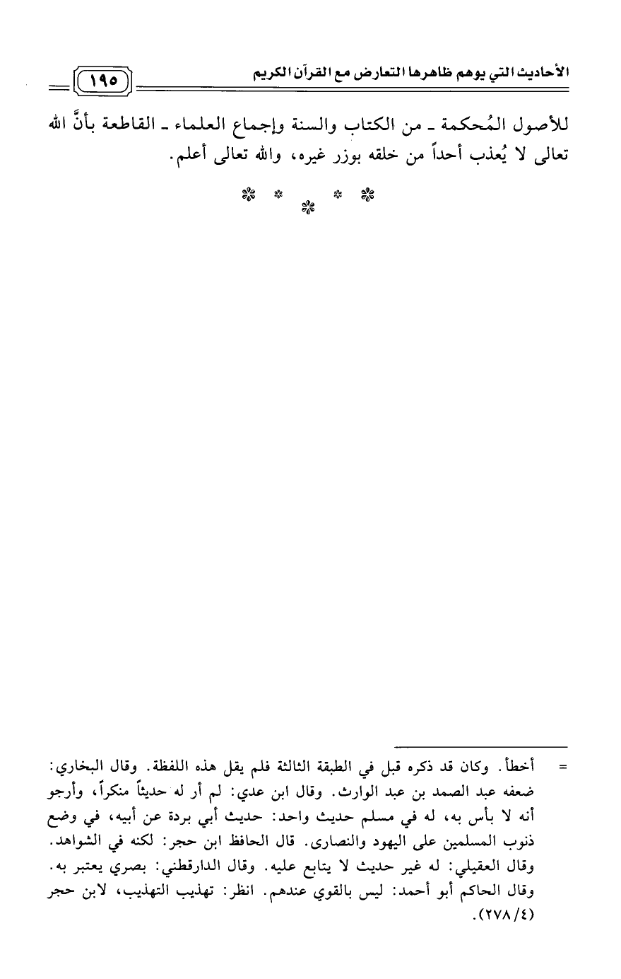 للأصول المُحكمة - من الكتاب والسنة وإجماع العلماء - القاطعة بأنَّ الله تعالى لا يُعذب أحداً من خلقه بوزر غيره، والله تعالى أعلم.
