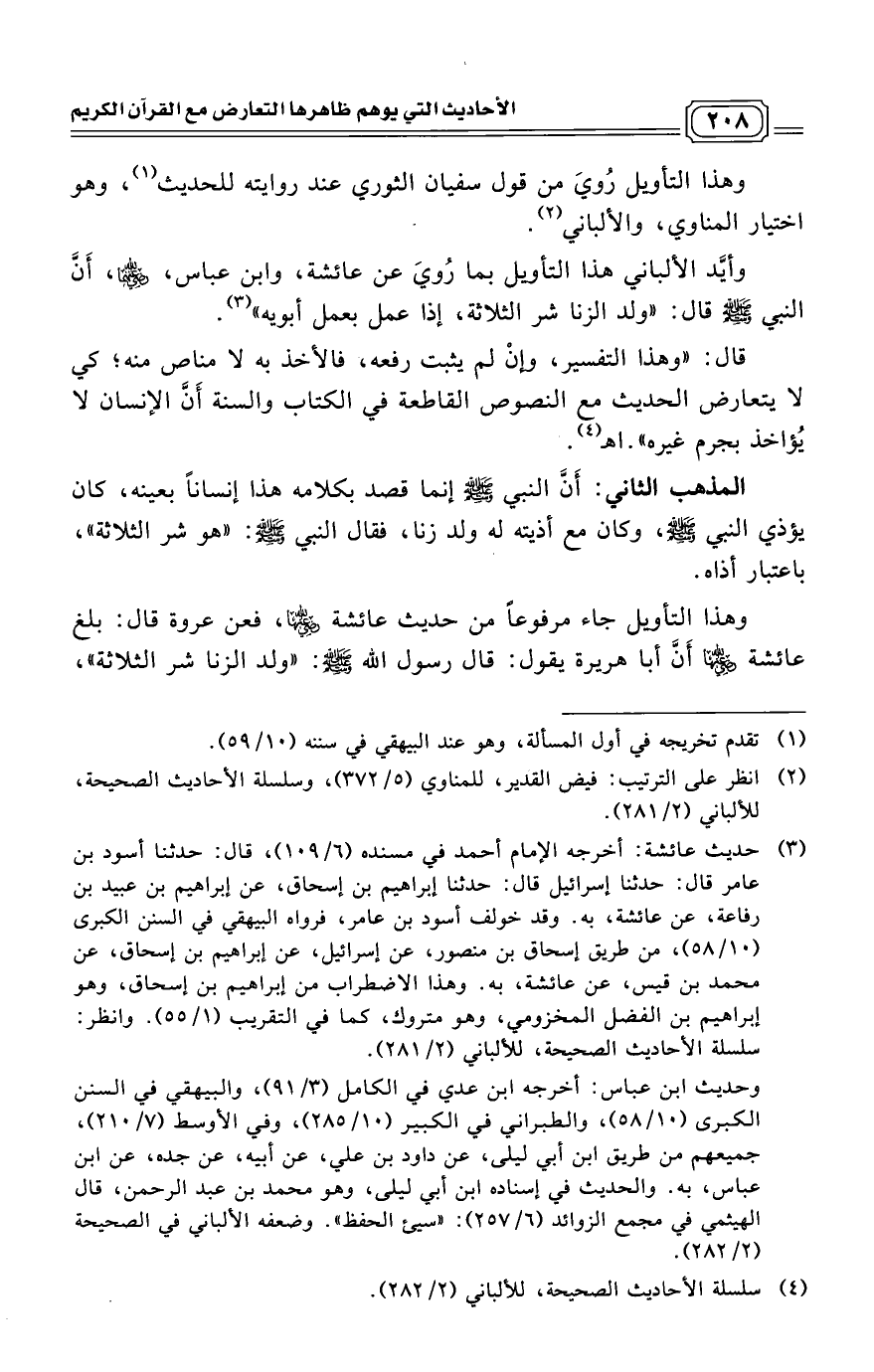 وأيَّد الألباني هذا التأويل بما رُويَ عن عائشة، وابن عباس، رضي الله عنهما، أَنَّ النبي - صلى الله عليه وسلم - قال: "ولد الزنا شر الثلاثة، إذا عمل بعمل أبويه". (¬3)