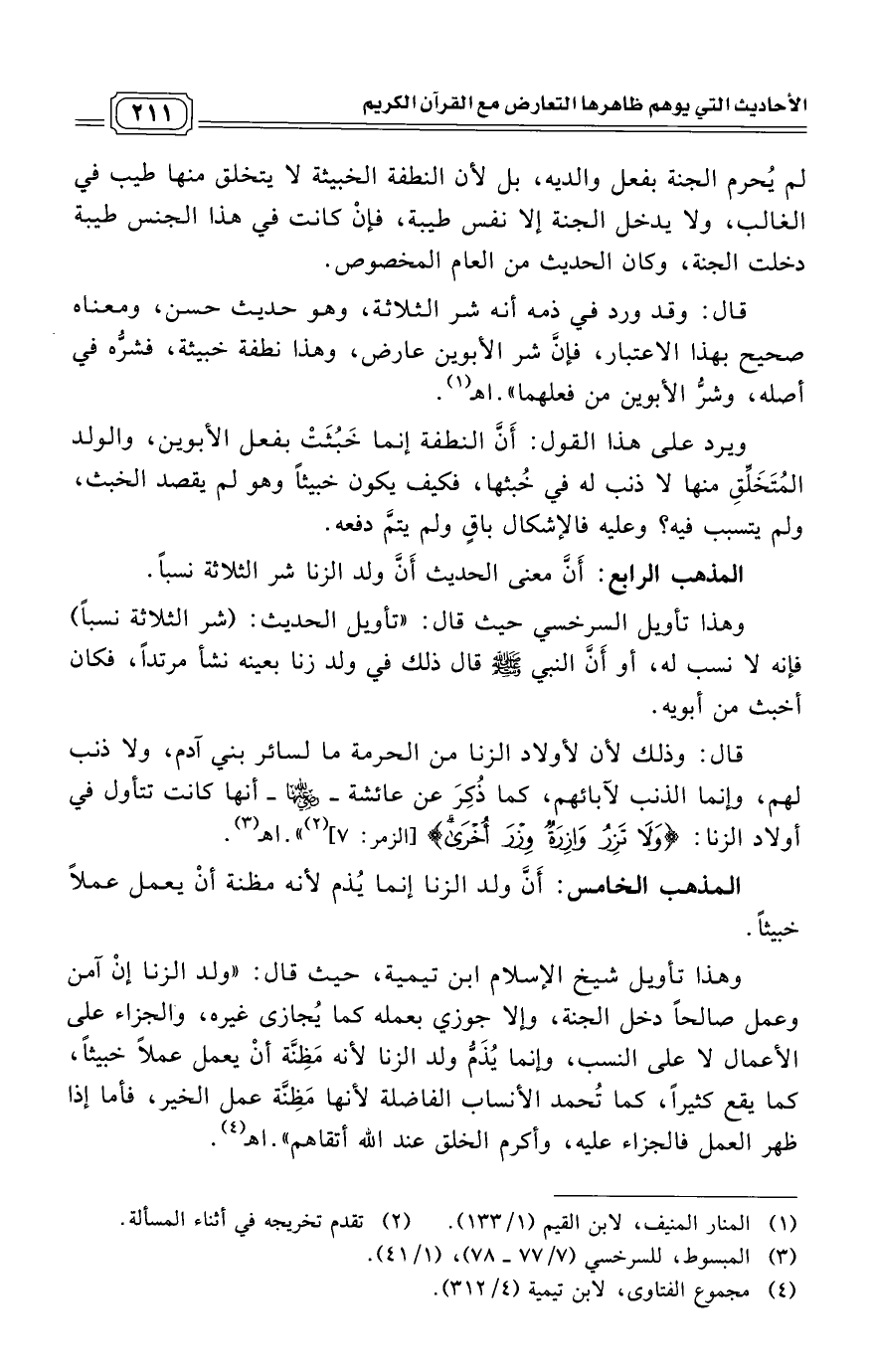 وهذا تأويل شيخ الإسلام ابن تيمية، حيث قال: "ولد الزنا إنْ آمن وعمل صالحاً دخل الجنة، وإلا جوزي بعمله كما يُجازى غيره، والجزاء على الأعمال لا على النسب، وإنما يُذَمُّ ولد الزنا لأنه مَظِنَّة أنْ يعمل عملاً خبيثاً، كما يقع كثيراً، كما تُحمد الأنساب الفاضلة لأنها مَظِنَّة عمل الخير، فأما إذا ظهر العمل فالجزاء عليه، وأكرم الخلق عند الله أتقاهم". اهـ (¬4)