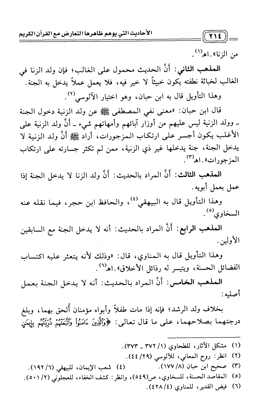 المذهب الخامس: أَنَّ المراد بالحديث: أنه لا يدخل الجنة بعمل أصليه، بخلاف ولد الرشد؛ فإنه إذا مات طفلاً وأبواه مؤمنان أُلحق بهما، وبلغ درجتهما بصلاحهما، على ما قال تعالى: (وَالَّذِينَ آمَنُوا وَاتَّبَعَتْهُمْ ذُرِّيَّتُهُمْ بِإِيمَانٍ