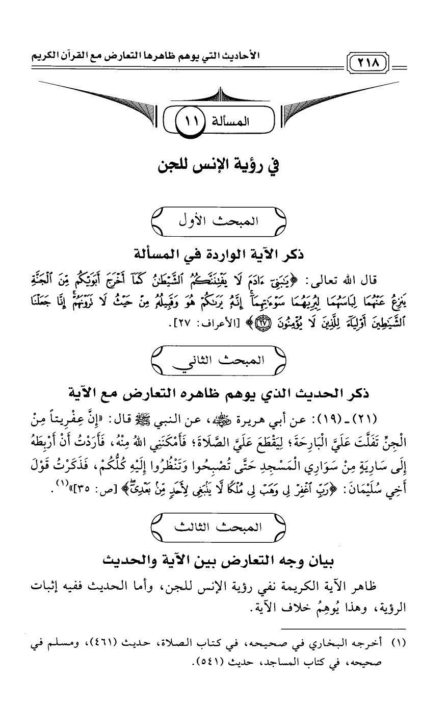 (21) ـ (19): عن أبي هريرة - رضي الله عنه -، عن النبي - صلى الله عليه وسلم - قال: "إِنَّ عِفْرِيتًا مِنْ الْجِنِّ تَفَلَّتَ عَلَيَّ الْبَارِحَةَ؛ لِيَقْطَعَ عَلَيَّ الصَّلَاةَ؛ فَأَمْكَنَنِي اللَّهُ مِنْهُ، فَأَرَدْتُ أَنْ أَرْبِطَهُ إِلَى سَارِيَةٍ مِنْ سَوَارِي الْمَسْجِدِ حَتَّى تُصْبِحُوا وَتَنْظُرُوا إِلَيْهِ كُلُّكُمْ، فَذَكَرْتُ قَوْلَ أَخِي سُلَيْمَانَ: (قَالَ رَبِّ اغْفِرْ لِي وَهَبْ لِي مُلْكًا لَا يَنْبَغِي لِأَحَدٍ مِنْ بَعْدِي) [ص: 35] ". (¬1)