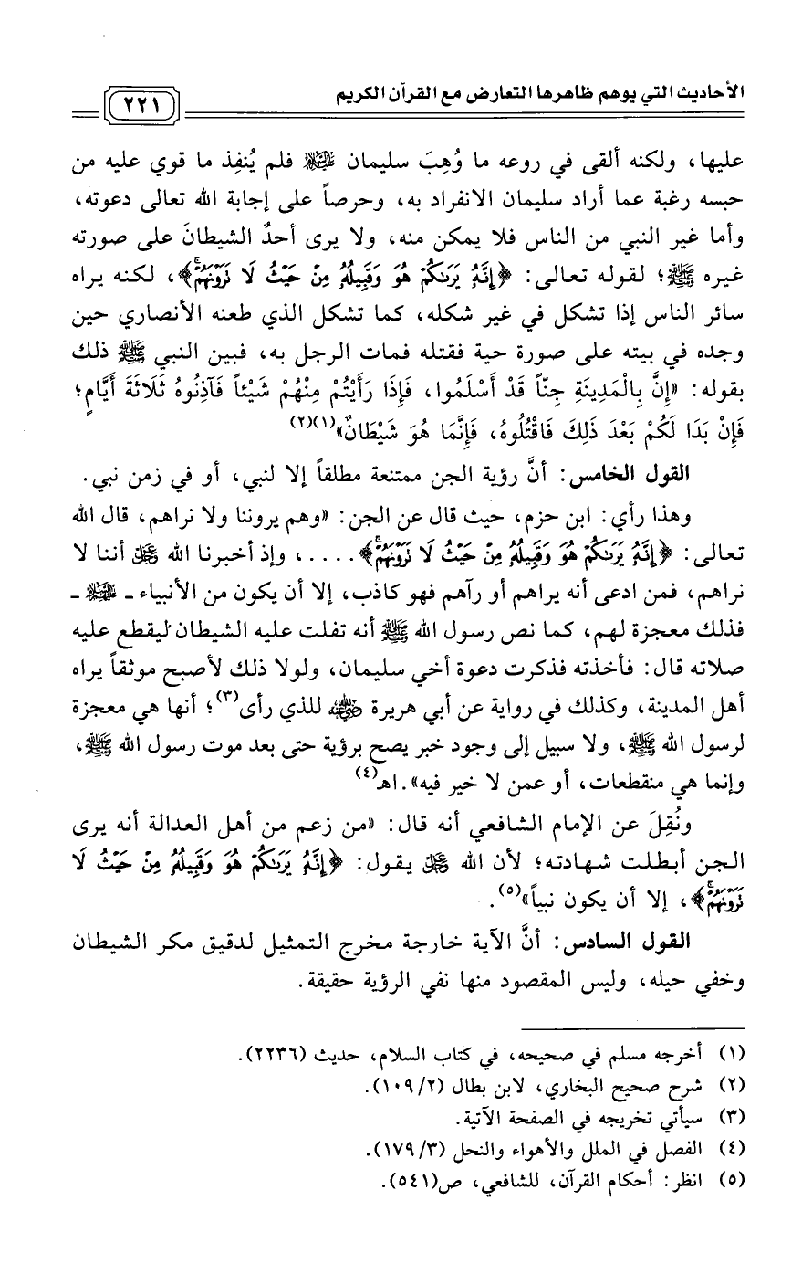 وهذا رأي: ابن حزم، حيث قال عن الجن: "وهم يروننا ولا نراهم، قال الله تعالى: (إِنَّهُ يَرَاكُمْ هُوَ وَقَبِيلُهُ مِنْ حَيْثُ لَا تَرَوْنَهُمْ) .... ، وإذ أخبرنا الله عز وجل أننا لا نراهم، فمن ادعى أنه يراهم أو رآهم فهو كاذب، إلا أن يكون من الأنبياء - عليهم السلام - فذلك معجزة لهم، كما نص رسول الله - صلى الله عليه وسلم - أنه تفلت عليه الشيطان ليقطع عليه صلاته قال: فأخذته فذكرت دعوة أخي سليمان، ولولا ذلك لأصبح موثقاً يراه أهل المدينة، وكذلك في رواية عن أبي هريرة - رضي الله عنه - للذي رأى (¬3)؛ أنها هي معجزة لرسول الله - صلى الله عليه وسلم -، ولا سبيل إلى وجود خبر يصح برؤية حتى بعد موت رسول الله - صلى الله عليه وسلم -، وإنما هي منقطعات، أو عمن لا خير فيه". اهـ (¬4)