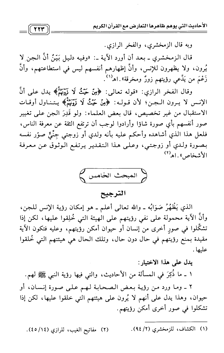 الذي يَظْهُرُ صَوَابُه - والله تعالى أعلم - هو إمكان رؤية الإنس للجن، وأنَّ الآية محمولة على نفي رؤيتهم على الهيئة التي خُلِقوا عليها، لكن إذا تشكَّلوا في صورٍ أخرى من إنسان أو حيوان أمكن رؤيتهم، وعليه فتكون الآية مقيدة بمنع رؤيتهم في حال دون حال، وتلك الحال هي هيئتهم التي خُلقوا عليها.
