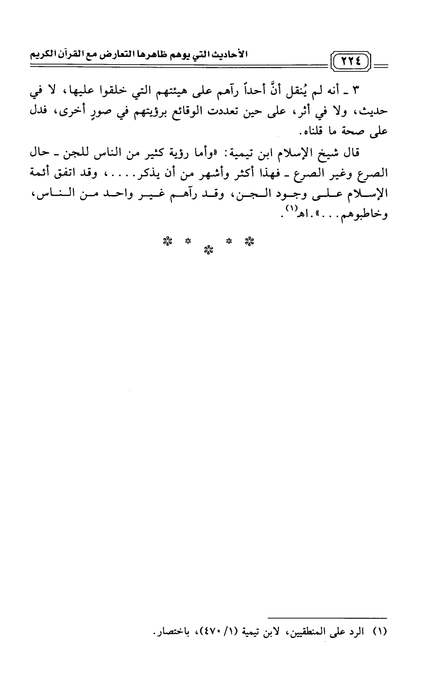 قال شيخ الإسلام ابن تيمية: "وأما رؤية كثير من الناس للجن - حال الصرع وغير الصرع - فهذا أكثر وأشهر من أن يذكر .... ، وقد اتفق أئمة الإسلام على وجود الجن، وقد رآهم غير واحد من الناس، وخاطبوهم ... ". اهـ (¬1)