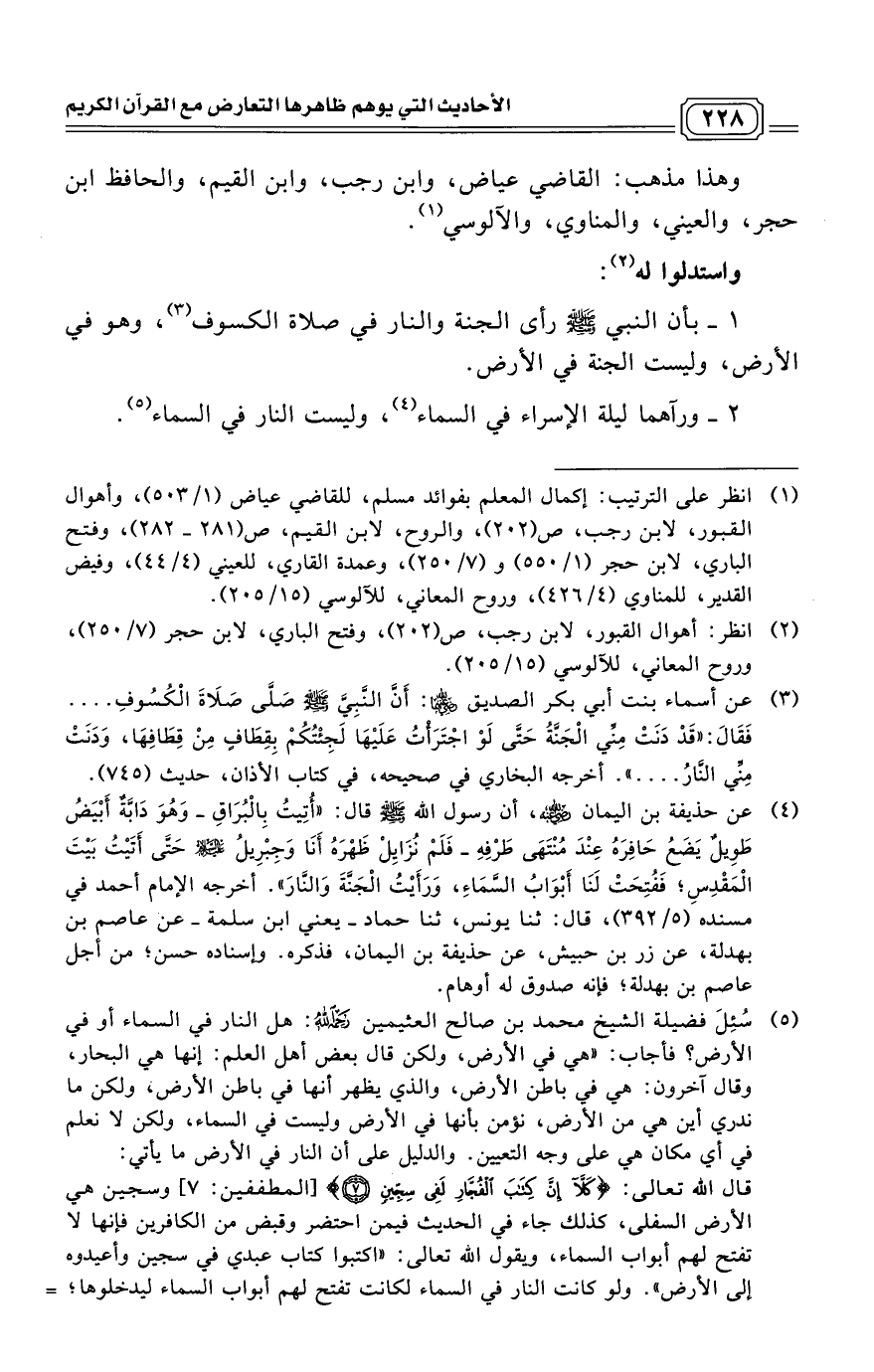 (¬1) انظر على الترتيب: إكمال المعلم بفوائد مسلم، للقاضي عياض (1/ 503)، وأهوال القبور، لابن رجب، ص (202)، والروح، لابن القيم، ص (281 - 282)، وفتح الباري، لابن حجر (1/ 550) و (7/ 250)، وعمدة القاري، للعيني (4/ 44)، وفيض القدير، للمناوي (4/ 426)، وروح المعاني، للآلوسي (15/ 205).