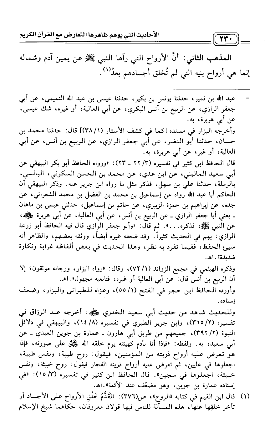 (¬1) قال ابن القيم في كتابه "الروح"، ص (376): "تَقَدُّمُ خَلْقِ الأرواح على الأجساد أو تأخر خلقِها عنها، هذه المسألة للناس فيها قولان معروفان، حكاهما شيخ الإسلام =