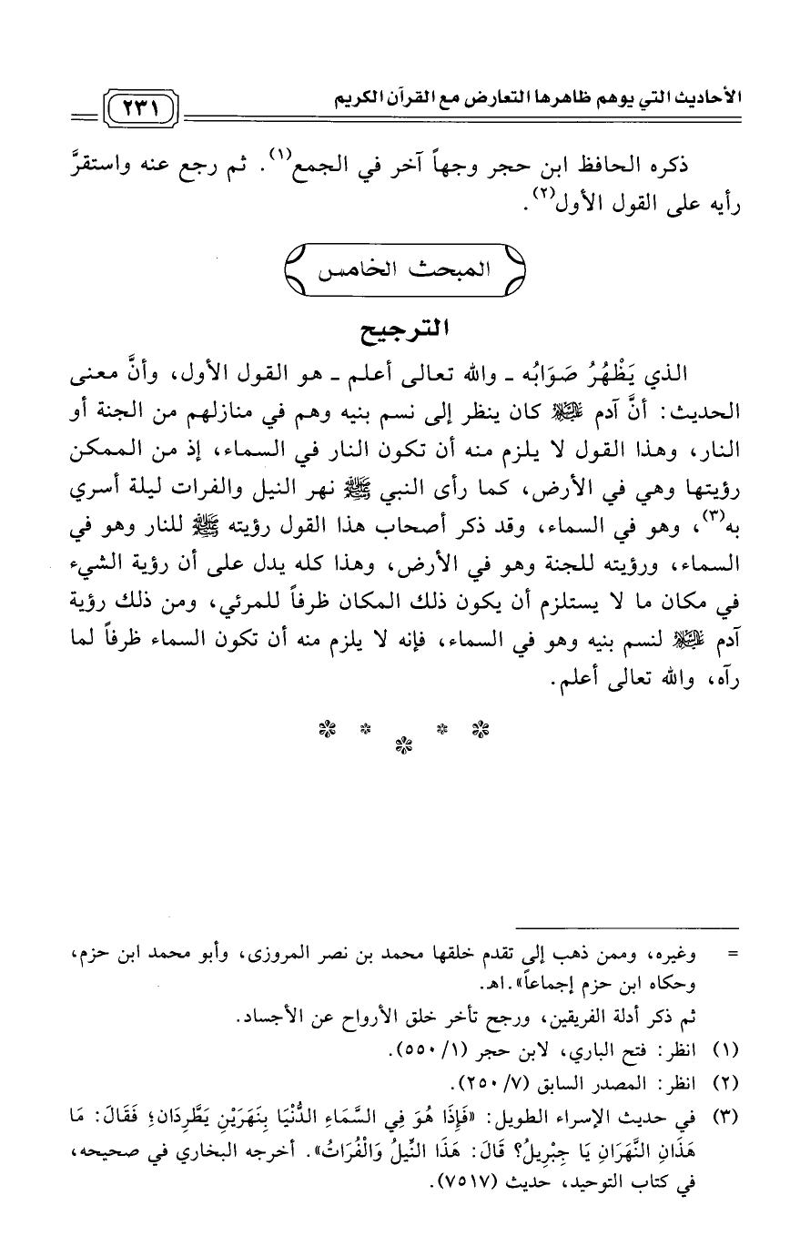 الذي يَظْهُرُ صَوَابُه ـ والله تعالى أعلم ـ هو القول الأول، وأنَّ معنى الحديث: أنَّ آدم - عليه السلام- كان ينظر إلى نسم بنيه وهم في منازلهم من الجنة أو النار، وهذا القول لا يلزم منه أن تكون النار في السماء، إذ من الممكن رؤيتها وهي في الأرض، كما رأى النبي - صلى الله عليه وسلم - نهر النيل والفرات ليلة أسري به (¬3)، وهو في السماء، وقد ذكر أصحاب هذا القول رؤيته - صلى الله عليه وسلم - للنار وهو في السماء، ورؤيته للجنة وهو في الأرض، وهذا كله يدل على أن رؤية الشيء في مكان ما لا يستلزم أن يكون ذلك المكان ظرفاً للمرئي، ومن ذلك رؤية آدم - عليه السلام- لنسم بنيه وهو في السماء لا يلزم منه أن تكون السماء ظرفاً لما رآه، والله تعالى أعلم.