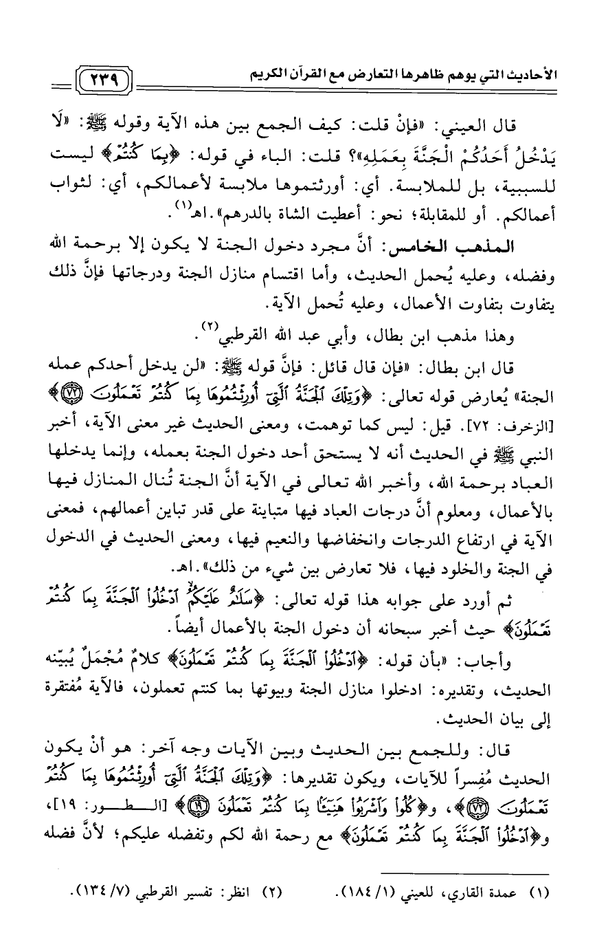 وأجاب: "بأن قوله: (ادْخُلُوا الْجَنَّةَ بِمَا كُنْتُمْ تَعْمَلُونَ) [النحل: 32] كلامٌ مُجْمَلٌ يُبيّنه الحديث، وتقديره: ادخلوا منازل الجنة وبيوتها بما كنتم تعملون، فالآية مُفتقرة إلى بيان الحديث.