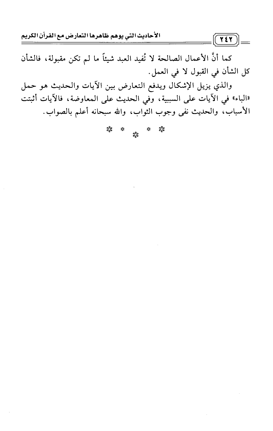 والذي يزيل الإشكال ويدفع التعارض بين الآيات والحديث هو حمل "الباء" في الآيات على السببية، وفي الحديث على المعاوضة، فالآيات أثبتت الأسباب، والحديث نفى وجوب الثواب، والله سبحانه أعلم بالصواب.