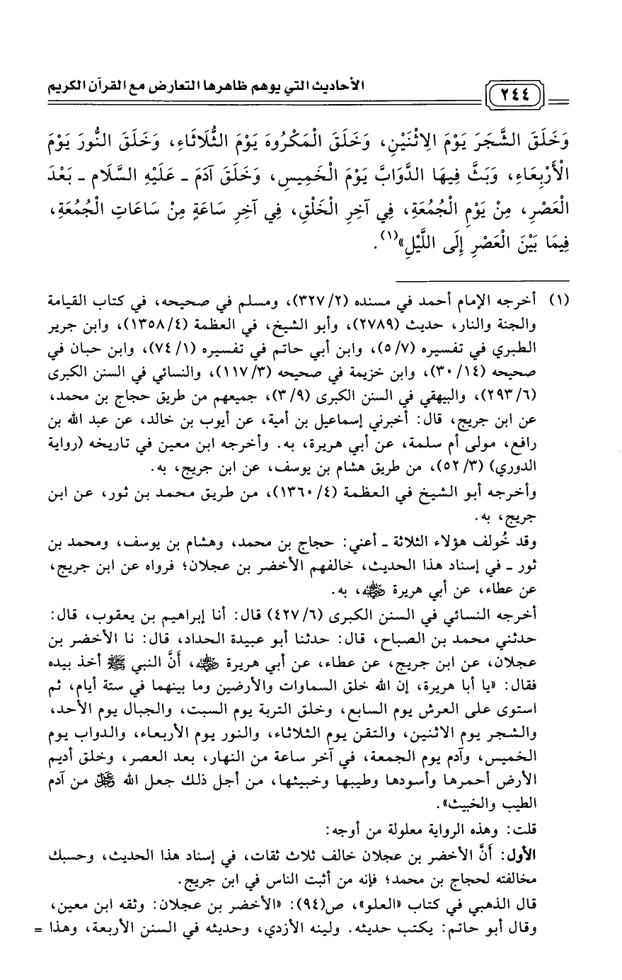 وَخَلَقَ الشَّجَرَ يَوْمَ الِاثْنَيْنِ، وَخَلَقَ الْمَكْرُوهَ يَوْمَ الثُّلَاثَاءِ، وَخَلَقَ النُّورَ يَوْمَ الْأَرْبِعَاءِ، وَبَثَّ فِيهَا الدَّوَابَّ يَوْمَ الْخَمِيسِ، وَخَلَقَ آدَمَ - عَلَيْهِ السَّلَام - بَعْدَ الْعَصْرِ، مِنْ يَوْمِ الْجُمُعَةِ، فِي آخِرِ الْخَلْقِ، فِي آخِرِ سَاعَةٍ مِنْ سَاعَاتِ الْجُمُعَةِ، فِيمَا بَيْنَ الْعَصْرِ إِلَى اللَّيْلِ". (¬1)