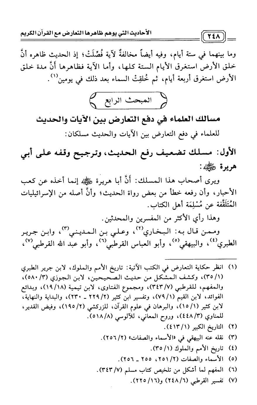 (¬1) انظر حكاية التعارض في الكتب الآتية: تاريخ الأمم والملوك، لابن جرير الطبري (1/ 35)، وكشف المشكل من حديث الصحيحين، لابن الجوزي (3/ 580)، والمفهم، للقرطبي (7/ 343)، ومجموع الفتاوى، لابن تيمية (18/ 19)، وبدائع الفوائد، لابن القيم (1/ 79)، وتفسير ابن كثير