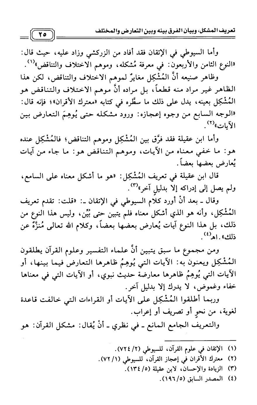 وقال ـ بعد أنْ أورد كلام السيوطي في الإتقان ـ: «قلت: تقدم تعريف المُشْكِل، وأنه هو الذي أشكل معناه فلم يتبين حتى بُيّن، وليس هذا النوع من ذلك، بل هذا النوع آيات يُعارض بعضها بعضاً، وكلام الله تعالى مُنزَّهٌ عن ذلك». اهـ (¬4)