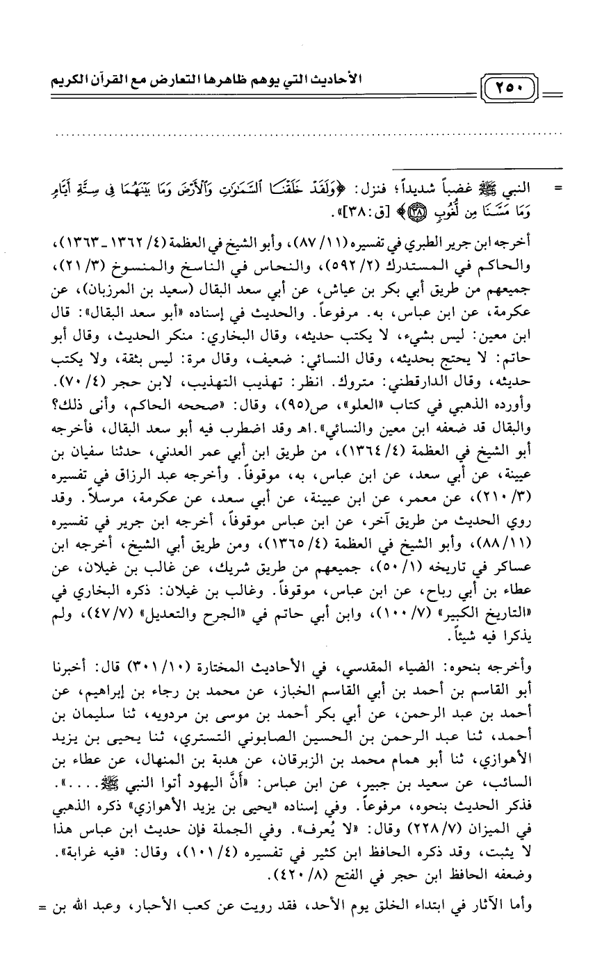 = النبي - صلى الله عليه وسلم - غضباً شديداً؛ فنزل: (وَلَقَدْ خَلَقْنَا السَّمَاوَاتِ وَالْأَرْضَ وَمَا بَيْنَهُمَا فِي سِتَّةِ أَيَّامٍ وَمَا مَسَّنَا مِنْ لُغُوبٍ) [ق: 38] ".